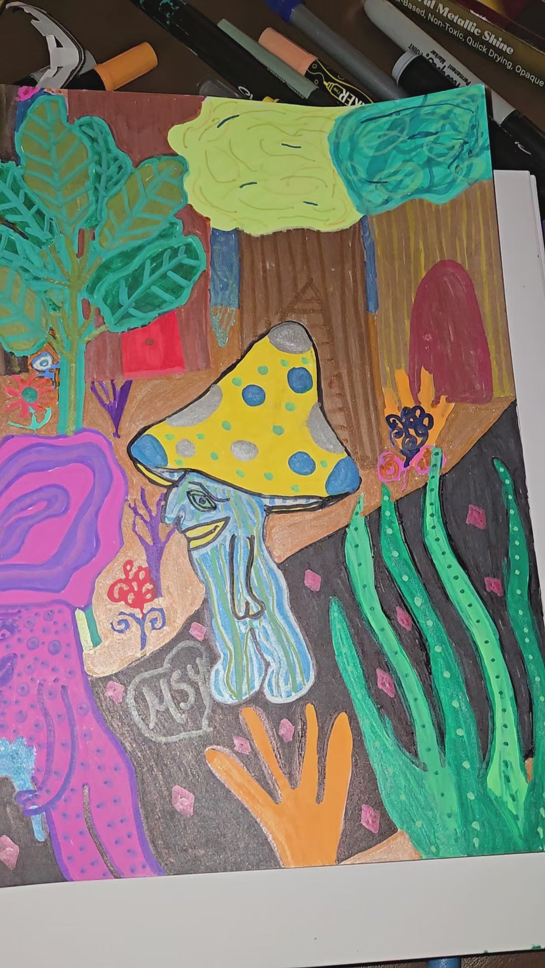 Vivid Color Story: The composition uses a high-contrast palette of electric purples, acid greens, sunny yellows, and deep teals, grounded by rich earth tones and dark shadows. It's an instant mood-booster and a feast for the eyes!