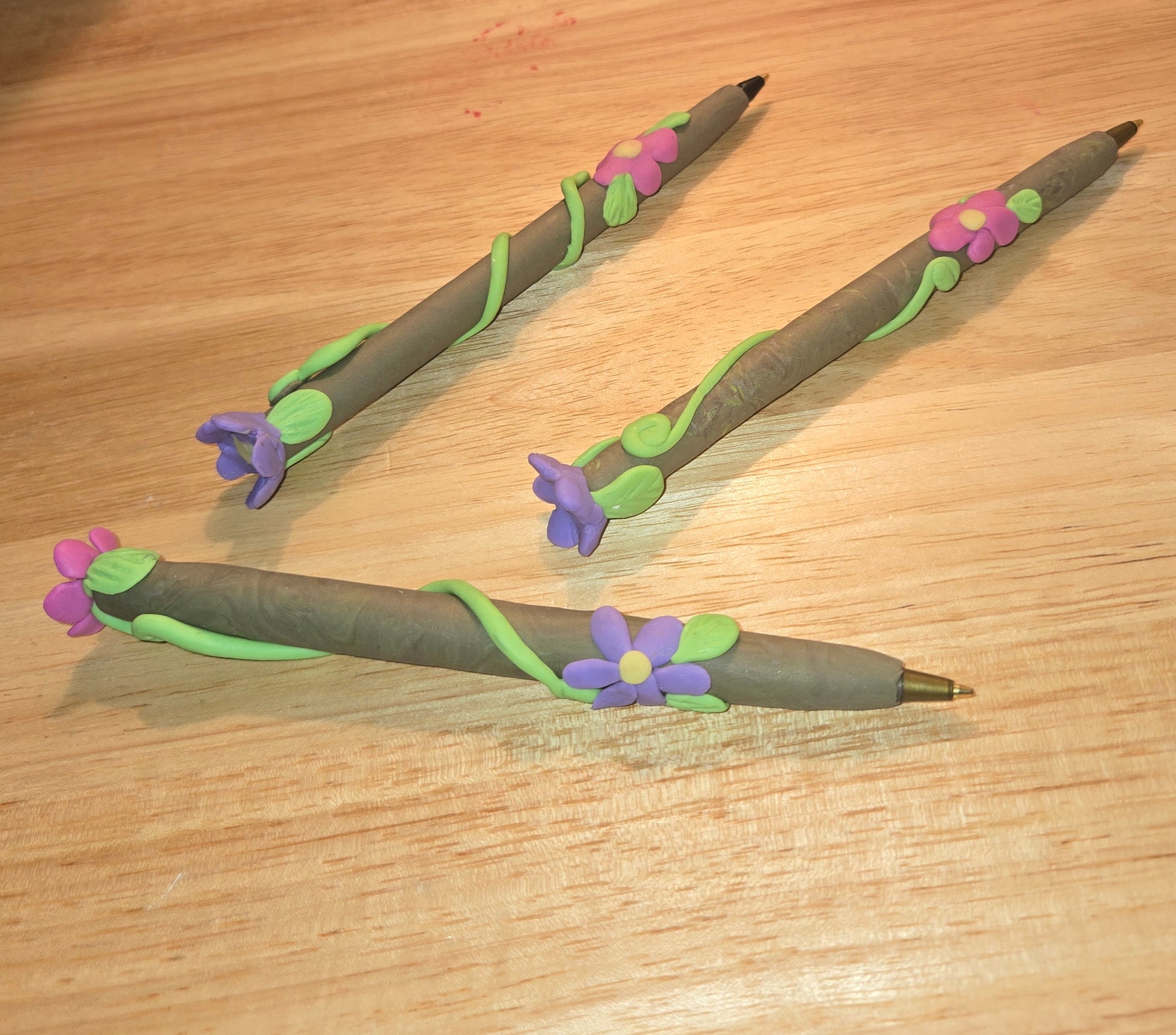 Inspired by woodland magic and ancient craft, these pens feature detailed polymer clay vines gracefully wrapped around an earthen-toned base, culminating in vibrant, three-dimensional sculpted flowers. The natural matte texture of the clay is left uncovered to emphasize the organic feel and dedicated craftsmanship of the piece.