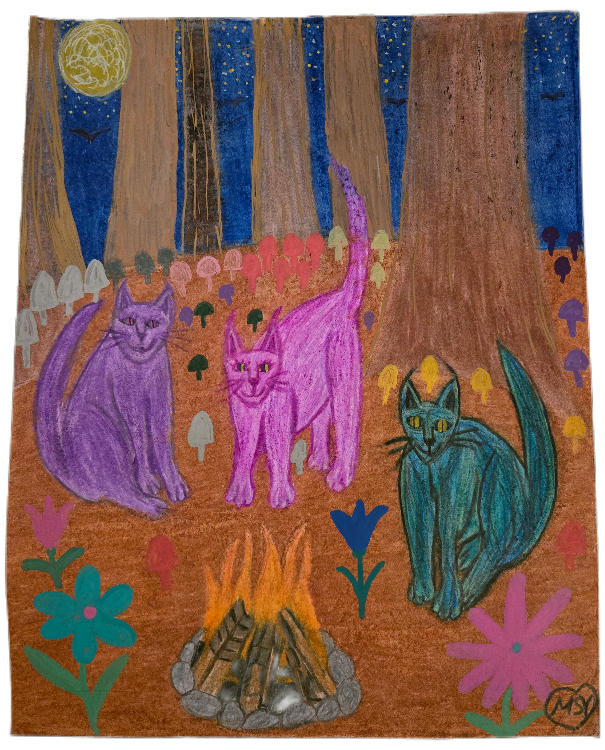 All around them, the enchanted forest comes alive: towering trees under a star-sprinkled sky, bats in quiet flight, clusters of silver and rainbow-hued mushrooms, and blossoms both tulip-like and daisy-like, blooming as though conjured from starlight. The fire’s warm glow dances across their watchful eyes, casting them as guardians, tricksters, and keepers of wild wisdom.