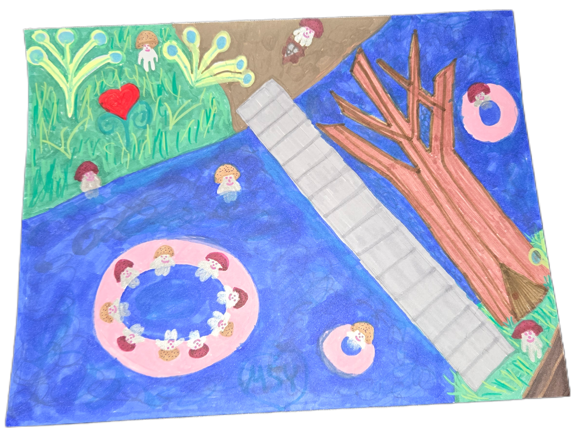 - The River Gathering: The centerpiece is the large, central pink inner tube where multiple creatures are gathered in a tight circle. This suggests an intimate communal ritual—story-sharing or quiet bonding—right in the curve of the river.