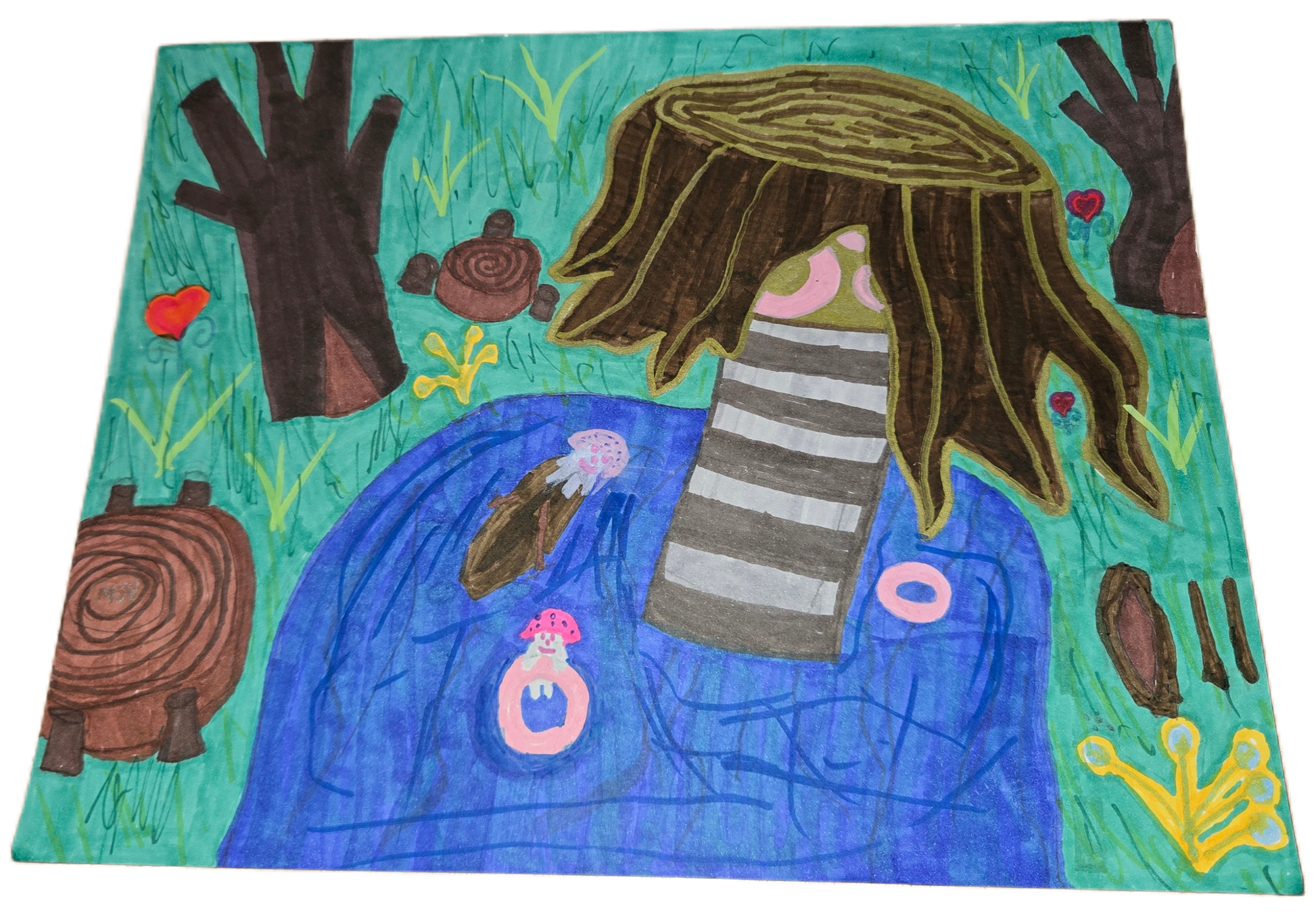 This twelfth original artwork offers a dramatic, close-up view of the Mycelium Folk's incredible ingenuity. "The Grand Stump Dock" reveals the vast, repurposed Tree Stump that serves as the central Storage and Dock for all river transport on the Blue River.