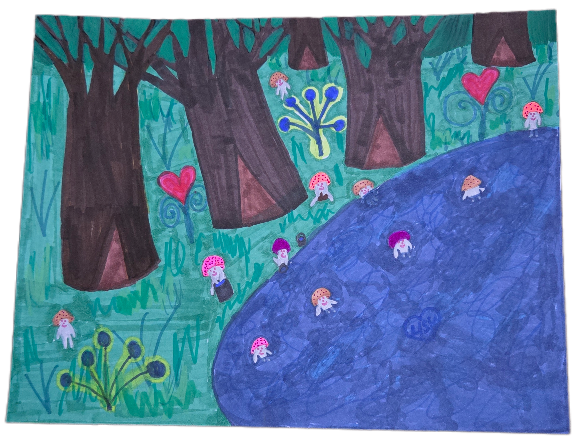 This fifth original artwork, "Swimming and Play on the Blue River," transports us to a perfect day in the Mycelium Folk's neighborhood. It is a peaceful, domestic scene showcasing the harmonious balance between daily chores and simple joys right beside the powerful Blue River—the essential waterway that flows through their entire civilization.