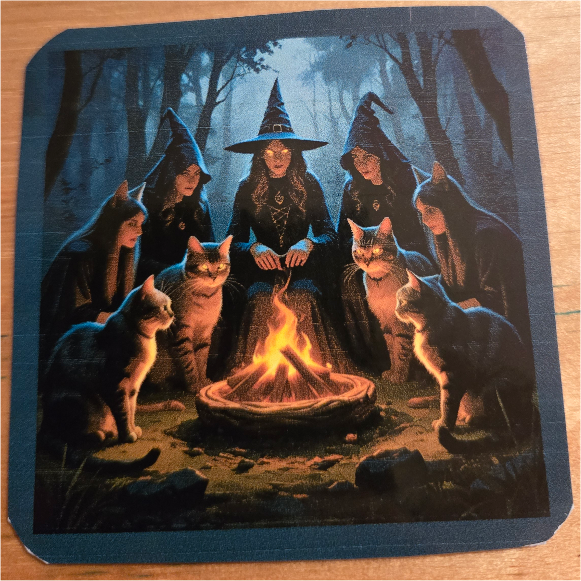 Six witches sit in a perfect circle around the fire, their silhouettes lit by the golden blaze. Five cats gather with them, guardians and familiars bound by unseen threads. The flames dance, shadows sway, and the night becomes a living hymn of unity and spellcraft.